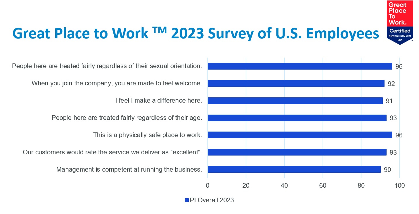 PI employees are encouraged to engage with company leadership and raise concerns and questions in-person, via e-mail (anonymously if desired), or at our quarterly employee communications meeting with the CEO and senior management team. We conduct an annual survey to gauge employee satisfaction. In the 2023 survey, 85% of respondents stated that Power Integrations is a great place to work (compared to a national average of 57%), resulting in the company receiving Great Place to Work Certification™. See selected survey results.